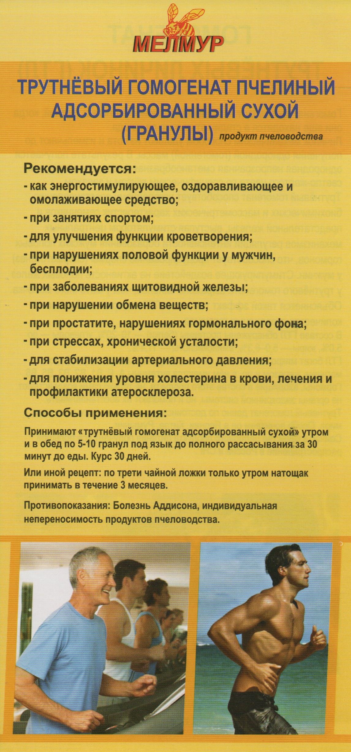 Трутнёвый гомогенат - оказывает стимулирующее воздействие на активность половых желез у мужчин, которое выражено сильнее, чем у маточного молочка, объясняется такой эффект тем, что в гомогенате трутневых личинок содержится большое количество стероидных гормонов.